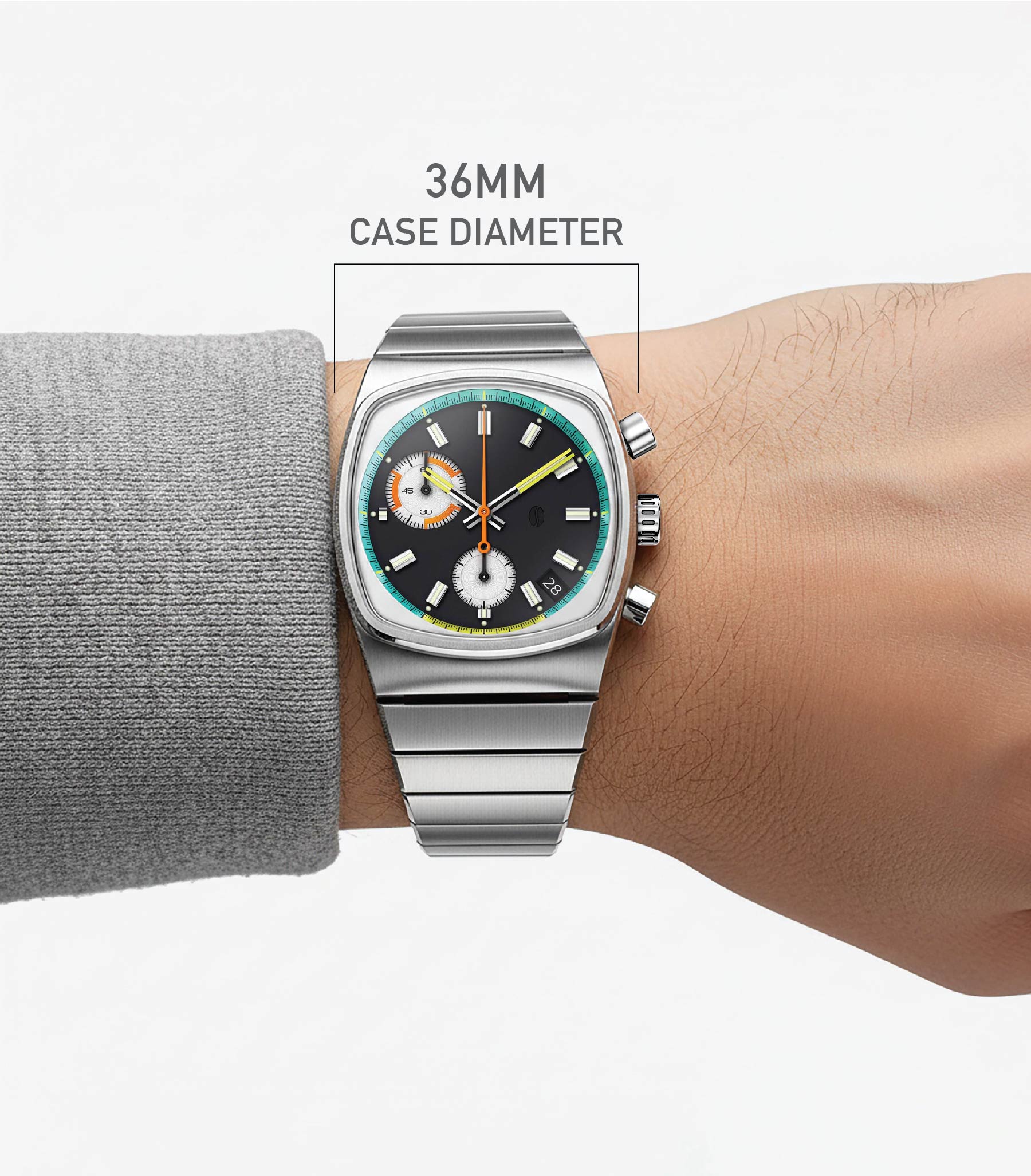 Offering a classic - compact style with its 1970s style case. Blended steel and contrasting brushed components give this watch its industrial styling and clarity. Above all else, the 36mm size makes this watch distinctive to its era while making it comfortable and wearable for any occasion.